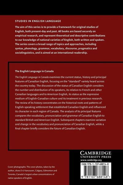 The English Language in Canada examines the current status, history and principal features of Canadian English, focusing on the 'standard' variety heard across the country today. The discussion of the status of Canadian English considers the number and distribution of its speakers, its relation to French and other Canadian languages and to American English, its status as the expressive medium of English Canadian culture and its treatment in previous research. The review of its history concentrates on the historical roots and patterns of English-speaking settlement that established Canadian English and influenced its character in each region of Canada. The analysis of its principal features compares the vocabulary, pronunciation and grammar of Canadian English to standard British and American English. Subsequent chapters examine variation and change in the vocabulary and pronunciation of Canadian English, while a final chapter briefly considers the future of Canadian English.