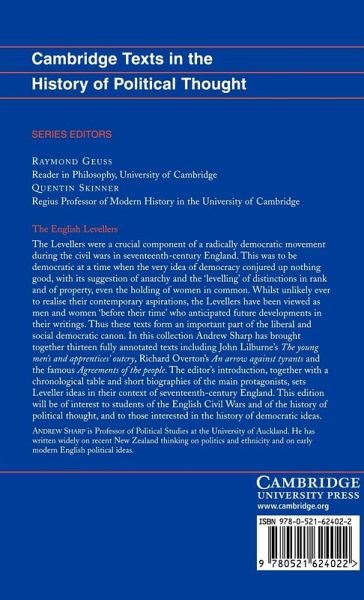 Introduction: the English Levellers 1645-1649; Chronological table; Bibliographical note; Notes on the texts; Leveller texts: 1. John Lilburne 'On the 150th page': an untitled broadsheet of August 1645; 2. William Walwyn Toleration justified and persecution condemned 29 January 1646; 3. John Lilburne Postscript to The freeman's freedom vindicated 16 June 1646; 4. Richard Overton with William Walwyn's collaboration A remonstrance of many thousand citizens 7 July 1646; 5. Richard Overton An arrow against all tyrants 12 October 1646; 6. William Walwyn Gold tried in the fire 4 June 1647; 7. Several hands An agreement of the people for a firm and present peace upon grounds of common right and freedom 28 October 1647; 8. Members of the New Model Army and civilian Levellers Extract from the debates at the General Council of the Army Putney 29 October 1647; 9. John Lilburne and others The petition of 11 September 1648; 10. John Lilburne England's new chains discovered 26 February 1649; 11. William Walwyn and on behalf of John Lilburne Thomas Prince and Richard Overton A manifestation 14 April 1649; 12. John Lilburne William Walwyn Thomas Prince and Richard Overton An agreement of the free people of England 1 May 1649; 13. John Lilburne The young men's and the apprentices' outcry 29 August 1649; Select biographies; Index.