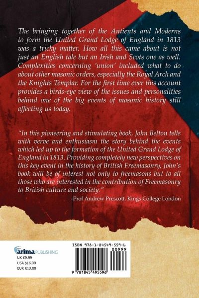 The bringing together of the Antients and Moderns to form the United Grand Lodge of England in 1813 was a tricky matter. How all this came about is not just an English tale but an Irish and Scots one as well. Complexities concerning 'union' included what to do about other masonic orders, especially the Royal Arch and the Knights Templar. For the first time ever this account provides a birds-eye view of the issues and personalities behind one of the big events of masonic history still affecting us today. "In this pioneering and stimulating book, John Belton tells with verve and enthusiasm the story behind the events which led up to the formation of the United Grand Lodge of England in 1813. Providing completely new perspectives on this key event in the history of British Freemasonry, John's book will be of interest not only to freemasons but to all those who are interested in the contribution of Freemasonry to British culture and society." - Prof Andrew Prescott, Kings College London