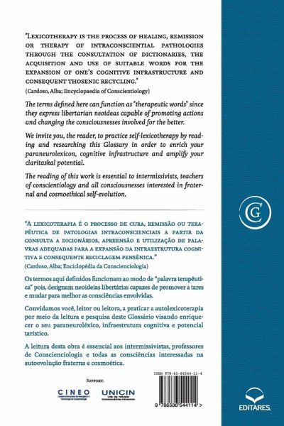 We invite you, the reader, to practice self-lexicotherapy by reading and researching this Glossary in order to erich your paraneurolexicon, cognitive infrastructure and amplify your claritaskal potential. The reading of this work is essential to intermissivists, teachers of conscientiology and all consciousnesses interested in fraternal and cosmoethical self-evolution. Convidamos você, leitor, a praticar a auto-lexicoterapia, lendo e pesquisando este Glossário, a fim de enriquecer seu vocabulário paraneurol, infraestrutura cognitiva e ampliar seu potencial claritaskal. A leitura deste trabalho é essencial para intermissivistas, professores de conscienciologia e todas as consciências interessadas em auto-evolução infraterna e cosmoética.