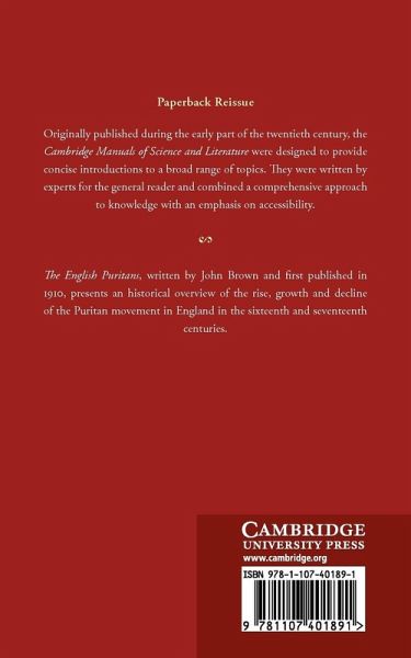 Originally published during the early part of the twentieth century, the Cambridge Manuals of Science and Literature were designed to provide concise introductions to a broad range of topics. They were written by experts for the general reader and combined a comprehensive approach to knowledge with an emphasis on accessibility. The English Puritans, written by John Brown and first published in 1910, presents an historical overview of the rise, growth and decline of the Puritan movement in England in the sixteenth and seventeenth centuries.