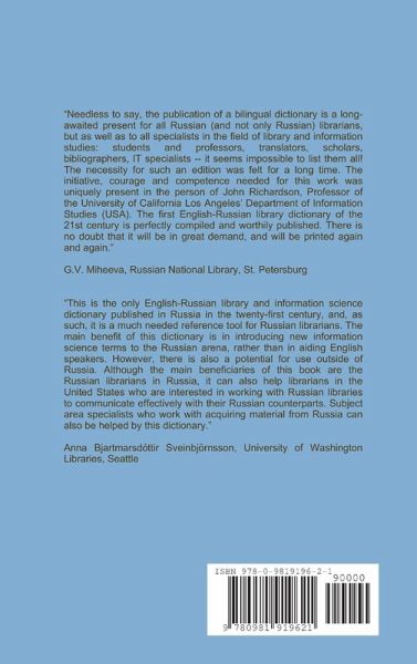 This volume is the only English-Russian library and information science dictionary designed for the 21st century.