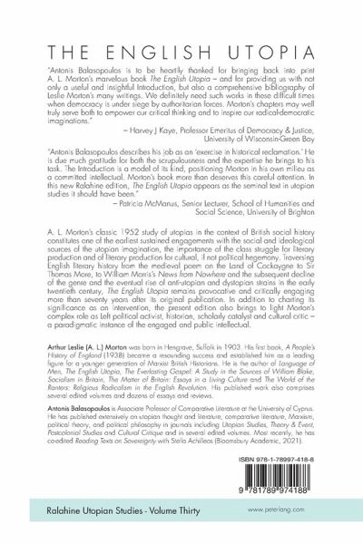 Antonis Balasopoulos is to be heartily thanked for bringing back into print A.L. Morton's' marvelous book The English Utopia - and for providing us with not only a useful and insightful Introduction, but also a comprehensive bibliography of Lesley Morton's many writings. We definitely need such works in these difficult times when democracy is under siege by authoritarian forces. Morton's chapters may well truly serve both to empower our critical thinking and to inspire our radical-democratic imaginations. - Harvey J Kaye, Professor Emeritus of Democracy & Justice, University of Wisconsin-Green Bay Antonis Balasopoulos describes his job as an 'exercise in historical reclamation.' He is due much gratitude for both the scrupulousness and the expertise he brings to his task. The Introduction is a model of its kind, positioning Morton in his own milieu as a committed intellectual. Morton's book more than deserves this careful attention. In this new Ralahine edition, The English Utopia appears as the seminal text in utopian studies it should have been. - Patricia McManus, Senior Lecturer, School of Humanities and Social Science, University of Brighton