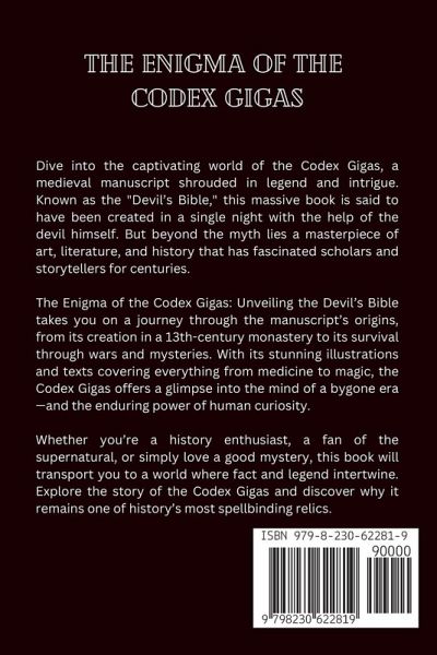 Dive into the captivating world of the Codex Gigas, a medieval manuscript shrouded in legend and intrigue. Known as the "Devil's Bible," this massive book is said to have been created in a single night with the help of the devil himself. But beyond the myth lies a masterpiece of art, literature, and history that has fascinated scholars and storytellers for centuries. The Enigma of the Codex Gigas: Unveiling the Devil's Bible takes you on a journey through the manuscript's origins, from its creation in a 13th-century monastery to its survival through wars and mysteries. With its stunning illustrations and texts covering everything from medicine to magic, the Codex Gigas offers a glimpse into the mind of a bygone era-and the enduring power of human curiosity. Whether you're a history enthusiast, a fan of the supernatural, or simply love a good mystery, this book will transport you to a world where fact and legend intertwine. Explore the story of the Codex Gigas and discover why it remains one of history's most spellbinding relics.
