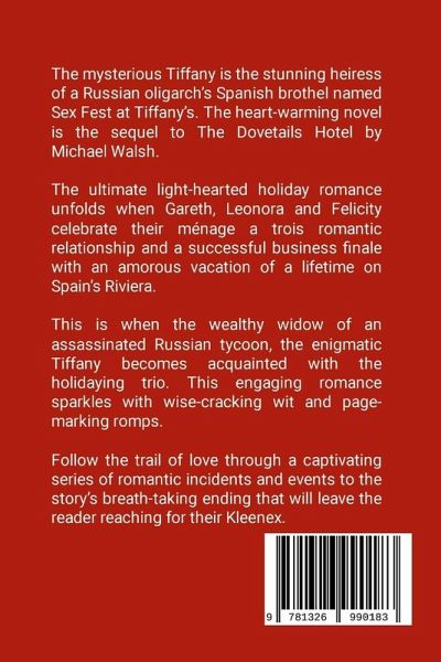 The mysterious Tiffany is the stunning heiress of a Russian oligarch's Spanish brothel named Sex Fest at Tiffany's. The heart-warming novel is the sequel to The Dovetails Hotel by Michael Walsh. The ultimate light-hearted holiday romance unfolds when Gareth, Leonora and Felicity celebrate their ménage a trois romantic relationship and a successful business finale with an amorous vacation of a lifetime on Spain's Riviera. This is when the wealthy widow of an assassinated Russian tycoon, the enigmatic Tiffany becomes acquainted with the holidaying trio. This engaging romance sparkles with wise-cracking wit and page-marking romps. Follow the trail of love through a captivating series of romantic incidents and events to the story's breath-taking ending that will leave the reader reaching for their Kleenex.