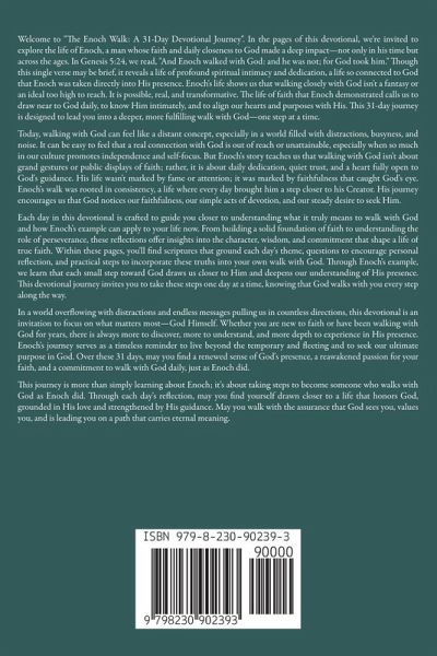 Welcome to "The Enoch Walk: A 31-Day Devotional Journey". In the pages of this devotional, we're invited to explore the life of Enoch, a man whose faith and daily closeness to God made a deep impact-not only in his time but across the ages. In Genesis 5:24, we read, "And Enoch walked with God: and he was not; for God took him." Though this single verse may be brief, it reveals a life of profound spiritual intimacy and dedication, a life so connected to God that Enoch was taken directly into His presence. Enoch's life shows us that walking closely with God isn't a fantasy or an ideal too high to reach. It is possible, real, and transformative. The life of faith that Enoch demonstrated calls us to draw near to God daily, to know Him intimately, and to align our hearts and purposes with His. This 31-day journey is designed to lead you into a deeper, more fulfilling walk with God-one step at a time. Today, walking with God can feel like a distant concept, especially in a world filled with distractions, busyness, and noise. It can be easy to feel that a real connection with God is out of reach or unattainable, especially when so much in our culture promotes independence and self-focus. But Enoch's story teaches us that walking with God isn't about grand gestures or public displays of faith; rather, it is about daily dedication, quiet trust, and a heart fully open to God's guidance. His life wasn't marked by fame or attention; it was marked by faithfulness that caught God's eye. Enoch's walk was rooted in consistency, a life where every day brought him a step closer to his Creator. His journey encourages us that God notices our faithfulness, our simple acts of devotion, and our steady desire to seek Him. Each day in this devotional is crafted to guide you closer to understanding what it truly means to walk with God and how Enoch's example can apply to your life now. From building a solid foundation of faith to understanding the role of perseverance, these reflections offer insights into the character, wisdom, and commitment that shape a life of true faith. Within these pages, you'll find scriptures that ground each day's theme, questions to encourage personal reflection, and practical steps to incorporate these truths into your own walk with God. Through Enoch's example, we learn that each small step toward God draws us closer to Him and deepens our understanding of His presence. This devotional journey invites you to take these steps one day at a time, knowing that God walks with you every step along the way. In a world overflowing with distractions and endless messages pulling us in countless directions, this devotional is an invitation to focus on what matters most-God Himself. Whether you are new to faith or have been walking with God for years, there is always more to discover, more to understand, and more depth to experience in His presence. Enoch's journey serves as a timeless reminder to live beyond the temporary and fleeting and to seek our ultimate purpose in God. Over these 31 days, may you find a renewed sense of God's presence, a reawakened passion for your faith, and a commitment to walk with God daily, just as Enoch did. This journey is more than simply learning about Enoch; it's about taking steps to become someone who walks with God as Enoch did. Through each day's reflection, may you find yourself drawn closer to a life that honors God, grounded in His love and strengthened by His guidance. May you walk with the assurance that God sees you, values you, and is leading you on a path that carries eternal meaning.