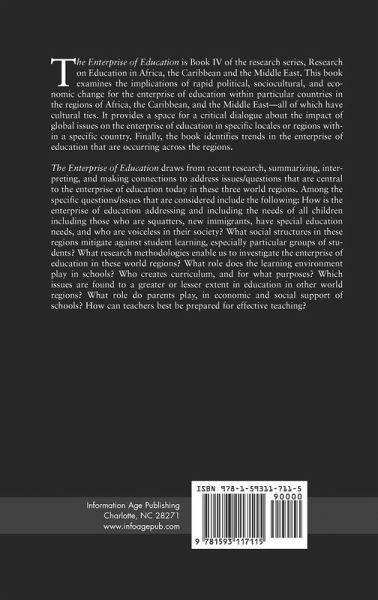The Enterprise of Education is Book IV of the research series, Research on Education in Africa, the Caribbean and the Middle East. This book examines the implications of rapid political, sociocultural, and economic change for the enterprise of education within particular countries in the regions of Africa, the Caribbean, and the Middle East-all of which have cultural ties. It provides a space for a critical dialogue about the impact of global issues on the enterprise of education in specific locales or regions within a specific country. Finally, the book identifies trends in the enterprise of education that are occurring across the regions. The Enterprise of Education draws from recent research, summarizing, interpreting, and making connections to address issues/questions that are central to the enterprise of education today in these three world regions. Among the specific questions/issues that are considered include the following: How is the enterprise of education addressing and including the needs of all children including those who are squatters, new immigrants, have special education needs, and who are voiceless in their society? What social structures in these regions mitigate against student learning, especially particular groups of students? What research methodologies enable us to investigate the enterprise of education in these world regions? What role does the learning environment play in schools? Who creates curriculum, and for what purposes? Which issues are found to a greater or lesser extent in education in other world regions? What role do parents play, in economic and social support of schools? How can teachers best be prepared for effective teaching?