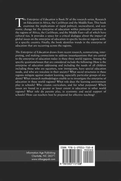 The Enterprise of Education is Book IV of the research series, Research on Education in Africa, the Caribbean and the Middle East. This book examines the implications of rapid political, sociocultural, and economic change for the enterprise of education within particular countries in the regions of Africa, the Caribbean, and the Middle East-all of which have cultural ties. It provides a space for a critical dialogue about the impact of global issues on the enterprise of education in specific locales or regions within a specific country. Finally, the book identifies trends in the enterprise of education that are occurring across the regions. The Enterprise of Education draws from recent research, summarizing, interpreting, and making connections to address issues/questions that are central to the enterprise of education today in these three world regions. Among the specific questions/issues that are considered include the following: How is the enterprise of education addressing and including the needs of all children including those who are squatters, new immigrants, have special education needs, and who are voiceless in their society? What social structures in these regions mitigate against student learning, especially particular groups of students? What research methodologies enable us to investigate the enterprise of education in these world regions? What role does the learning environment play in schools? Who creates curriculum, and for what purposes? Which issues are found to a greater or lesser extent in education in other world regions? What role do parents play, in economic and social support of schools? How can teachers best be prepared for effective teaching?