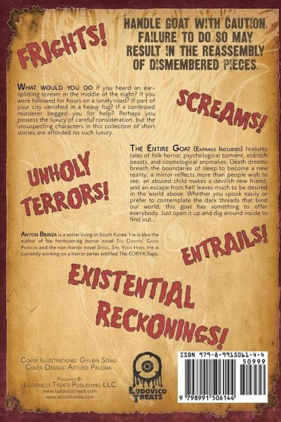 This collection of disturbing tales from horror author Anton Brinza takes you into the minds of people struggling to survive unspeakable terrors. An abused boy learns about life from a devilish new friend. A woman flees home with the certainty she has been cursed. A group of strangers encounter an anomaly inside a dense fog. A young woman's murderous dreams trickle into her waking life. A homeless man wishes to forget the gruesome crimes he witnessed. A shaman must answer for her deeds. Join these characters and more as they encounter nightmares, screams, stalkers, and the everlasting darkness of death. The Entire Goat (Entrails Included) features tales of folk horror, psychological torment, eldritch beasts, and cosmological anomalies. Whether you spook easily or prefer to contemplate the dark threads that bind our world, this goat has something to offer everybody. Purchase now to receive your pieces of the goat. Read them, play with them, cook them up for dinner, or rearrange them into any shape you like...just don't mishandle the goat, or it may come back to haunt you.