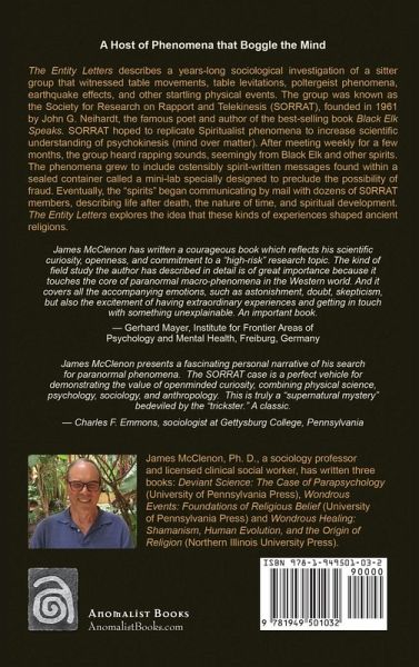 A Host of Phenomena that Boggle the Mind The Entity Letters describes a years-long sociological investigation of a sitter group that witnessed table movements, table levitations, poltergeist phenomena, earthquake effects, and other startling physical events. The group was known as the Society for Research on Rapport and Telekinesis (SORRAT), founded in 1961 by John G. Neihardt, the famous poet and author of the best-selling book Black Elk Speaks. SORRAT hoped to replicate Spiritualist phenomena to increase scientific understanding of psychokinesis (mind over matter). After meeting weekly for a few months, the group heard rapping sounds, seemingly from Black Elk and other spirits. The phenomena grew to include ostensibly spirit-written messages found within a sealed container called a mini-lab specially designed to preclude the possibility of fraud. Eventually, the "spirits" began communicating by mail with dozens of S0RRAT members, describing life after death, the nature of time, and spiritual development. The Entity Letters explores the idea that these kinds of experiences shaped ancient religions.