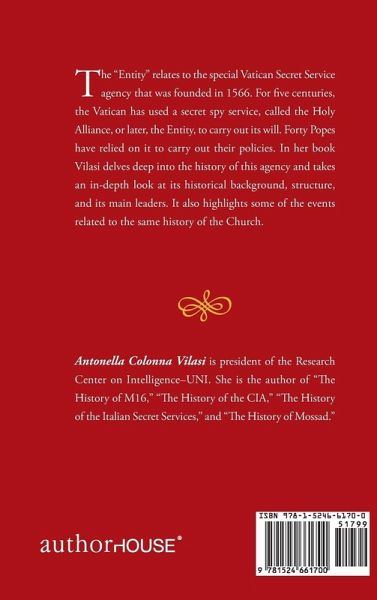 The "Entity" relates to the special Vatican Secret Service agency that was founded in 1566. For five centuries, the Vatican has used a secret spy service, called the Holy Alliance, or later, the Entity, to carry out its will. Forty Popes have relied on it to carry out their policies. In her book Vilasi delves deep into the history of this agency and takes an in-depth look at its historical background, structure, and its main leaders. It also highlights some of the events related to the same history of the Church.