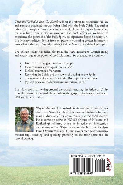THE ENTRANCE Into The Kingdom is an invitation to experience the joy and strength obtained through being filled with the Holy Spirit. The author takes you through scripture detailing the work of the Holy Spirit from before the new birth through the resurrection. The book offers an invitation to experience the presence of the Holy Spirit, an experience beyond description. The journey includes details from scripture in obtaining greater intimacy in your relationship with God the Father, God the Son, and God the Holy Spirit. The church today has fallen far from the New Testament Church living and witnessing in the power of the Holy Spirit. Be prepared to encounter: - God as an extravagant lover of all people - How to return extravagant love to God - Biblical assurance of salvation - Receiving the Spirit and the power of praying in the Spirit - The necessity of the baptism in the Holy Spirit in end times - Joy and peace in challenging and uncertain times The Holy Spirit is moving around the world, restoring the bride of Christ to no less than the original church where the gospel is both seen and heard. Will you be a part of it? Wayne Vermeer is a retired math teacher, where he was director of Youth for Christ. His career was followed by seven years as director of visitation ministry in his local church. He is currently active in HOME (House of Missions and Equipping) ministry, where he is active on intercession and healing teams. Wayne is also on the board of Katelyn's Fund Orphan Ministry. He has always been active on many mission trips, teaching, and speaking, primarily on the Holy Spirit and the second coming.