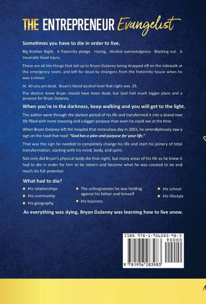 Sometimes you have to die in order to live. Big Brother Night. A fraternity pledge. Hazing. Alcohol overindulgence. Blacking out. A traumatic head injury. These are all the things that led up to Bryan Dulaney being dropped off on the sidewalk at the emergency room, and left for dead by strangers from the fraternity house when he was a minor. At .40 you are dead. Bryan's blood alcohol level that night was .39. The doctors knew Bryan should have been dead, but God had much bigger plans and a purpose for Bryan Dulaney. When you're in the darkness, keep walking and you will get to the light. The author went through the darkest period of his life and transformed it into a brand new life filled with more meaning and a bigger purpose than even he could see at the time. When Bryan Dulaney left the hospital that miraculous day in 2003, he serendipitously saw a sign on the road that read: "God has a plan and purpose for your life." That was the sign he needed to completely change his life and start his joinery of total transformation, starting with his mind, body, and spirit. Not only did Bryan's physical body die that night, but many areas of his life as he knew it had to die in order for him to be reborn and become what he was created to be and reach his full potential. What had to die? * His relationships * His community * His geography * The unforgiveness he was holding against his father and himself * His business * His school * His lifestyle As everything was dying, Bryan Dulaney was learning how to live anew. Bryan Dulaney changed the direction of his life and began to share his personal story with others as well as help others share their own stories. He did that through his business, The Perfect Funnel System(TM), and became "the Top 1% of all marketers and funnels experts in the world" according to Tony Robbins, the world's #1 motivational coach on helping people unlock their full potential in seconds instead of years. Bryan didn't do it alone. He turned to God every step of the way so he could stay focused and on purpose. Since then he's been on a mission to help people share their own stories and wisdom so they can increase their impact, influence, and income through is proprietary systems. If you're ready to die to the old and transform your life, to stop living in the safe zone, to let go of what isn't serving you so you can live your God-given purpose instead of one of regret and fear, then click the BUY NOW button and let's take this journey together.