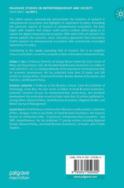 Zoltan J. Acs is Professor Emeritus at George Mason University Schar School of Policy and Government, USA. He founded Small Business Economics (co-editor in chief until 2021). Acs is a leading advocate of the importance of entrepreneurship for economic development. He has published more than 20 books and 100 articles in, among others, American Economic Review, Review of Economics and Statistics, and Research Policy. Esteban Lafuente is Professor at the Business School, Costa Rica Institute of Technology, Costa Rica. He also serves as Editor of Small Business Economics. Lafuente's research focuses on entrepreneurship, productivity, and territorial development. His publication record includes more than 30 articles published in, among others, Research Policy, Small Business Economics, Regional Studies, and British Journal of Management. László Szerb is Full Professor at the Faculty of Business and Economics, University of Pécs, Hungary. Szerb is also Editor of Small Business Economics. His research focuses on entrepreneurship - in particular entrepreneurship ecosystems - and SME competitiveness. He has published 77 journal articles (including Regional Studies, Research Policy, and Small Business Economics), 36 books, and 27 book chapters.