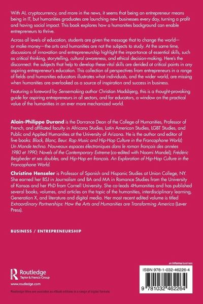 Across all levels of education, students are given the message that to change the world - or make money - the arts and humanities are not the subjects to study. At the same time, discussions of innovation and entrepreneurship highlight the importance of essential skills, such as critical thinking, storytelling, cultural awareness, and ethical decision-making. Here's the disconnect: the subjects that help to develop these vital skills are derided at critical points in any aspiring entrepreneur's education. This collection of perspectives from entrepreneurs in a range of fields and humanities educators illustrates what individuals, and the wider world, are missing when humanities are overlooked as a source of inspiration and success in business.