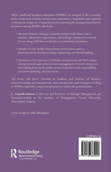 Micro, small and medium enterprises (MSMEs) are integral to the economic policy framework of India, and promote innovation, competition and equitable economic development. Comprehensively examining the management of family businesses among MSMEs, this book: ¿ discusses business strategy, corporate and personal values, vision, mission, stakeholder expectations, and strategic response to external factors along with their social and environmental orientation; ¿ includes 22 case studies drawn from varied sectors such as pharmaceuticals, food processing, engineering, and blood banking; ¿ documents rich experiences of Indian entrepreneurs and their unique entrepreneurial approaches towards management of social enterprises, loss-making firms in the public sector, corporate social responsibility, succession planning, and innovation. The book will prove essential to students and scholars of business, entrepreneurship and management, and entrepreneurs and managers working in MSMEs, especially young entrepreneurs as well as the general reader.