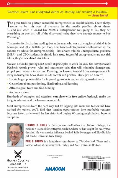 Why stumble alone on a risky venture on your way to failure when you can tap into the best ideas and minds for increasing your chances for success? Most entrepreneurs have had to learn things the hard way--concepts such as: big ideas rarely make great businesses; laboring on a business plan can be a waste of time; and you will need dramatically more start-up money than you originally thought you did. Lenoard Green, an experienced investor, entrepreneur, and business professor, has encapsulated together all the inside secrets, proven strategies, and mistakes experienced so that you can learn it all beforehand, rather than when all your capital is on the line. Based on his popular Ultimate Entrepreneurship course, The Entrepreneur's Playbook explains how to: Locate sure-bet opportunities for improving products Find funding Take calculated risks and minimize failure Get serious about positioning, distributing, and licensing Stripping away the complexity favored by business schools and the hype of the technology sector, the book reveals eighteen down-to-earth principles and dozens of tactics for every kind of business. Plus, the invaluable instruction available for you is now interactive. Dozens of exercises are given throughout the book that can be submitted online for feedback.