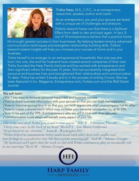 Trisha Harp, M.S., C.P.C., is an entrepreneur, researcher, speaker, author and coach. As an entrepreneur, you and your spouse are faced with a unique set of challenges and stressors. Trisha's research bears out that there is a Spillover Effect from desk to den and back again. In fact, 8 out of 10 entrepreneurs believe that a positive home life brought greater success to their businesses. By helping leaders employ advanced communication techniques and strengthen relationship building skills, Trisha's research-based insights will help you increase your success at home and in your business. Trisha herself is no stranger to an entrepreneurial household. Not only was she born into one, she and her husband have created several companies of their own. Trisha founded the Harp Family Institute and has worked with entrepreneurs and their significant others for the past 15 years. She has successfully integrated their personal and business lives and strengthened their relationships and communication. To date, Trisha has written 5 books and is in the process of writing 3 more. She has been featured in Inc. Magazine, Entrepreneur.com, Forbes.com and the Wall Street Journal.