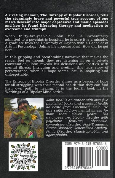 A riveting memoir, The Entropy of Bipolar Disorder, tells the stunningly brave and powerful true account of one man's descent into major depressive and manic episodes and how he found lifesaving therapy and medication to overcome and triumph. When thirty-five-year-old John Medl is involuntarily admitted to a psychiatric hospital, he is sure it is a mistake. A graduate from the University of Dayton with a Bachelor of Arts in Psychology, John's life appears ideal. How did he get here? In this gripping and breathtaking narrative that makes the reader feel as though they are listening in on a private conversation, John reveals his delusions and battles with mental illness. Intriguing and riveting, this true story of perseverance, when all hope seems lost, is inspiring and unforgettable. The Entropy of Bipolar Disorder shines as a beacon of hope for all struggling with their mental health that they can find their own path to healing. It is the fourth book in his Workings of a Bipolar Mind series. Get it Now!