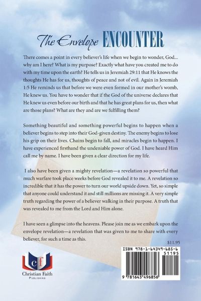 There comes a point in every believer's life when we begin to wonder, God . . . why am I here? What is my purpose? Exactly what have you created me to do with my time upon the earth? He tells us in Jeremiah 29:11 that He knows the thoughts He has for us, thoughts of peace and not of evil. Again in Jeremiah 1:5 He reminds us that before we were even formed in our mother's womb, He knew us. You have to wonder that if the God of the universe declares that He knew us even before our birth and that he has great plans for us, then what are those plans? What are they and are we fulfilling them? Something beautiful and something powerful begins to happen when a believer begins to step into their God-given destiny. The enemy begins to lose his grip on their lives. Chains begin to fall, and miracles begin to happen. I have experienced firsthand the undeniable power of God. I have heard Him call me by name. I have been given a clear direction for my life. I also have been given a mighty revelation-a revelation so powerful that much warfare took place weeks before God revealed it to me. A revelation so incredible that it has the power to turn our world upside down. Yet, so simple that anyone could understand it and still millions are missing it. A very simple truth regarding the power of a believer walking in their purpose. A truth that was revealed to me from the Lord and Him alone. I have seen a glimpse into the heavens. Please join me as we embark upon the envelope revelation-a revelation that was given to me to share with every believer, for such a time as this.