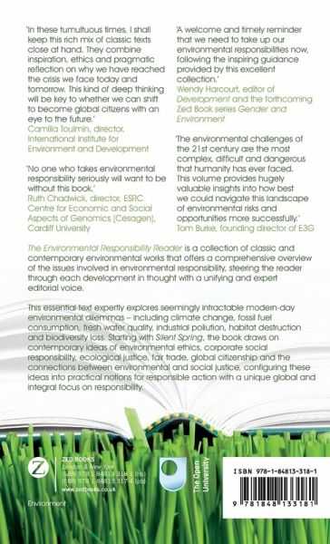 The Environmental Responsibility Reader is a definitive collection of classic and contemporary environmental works that offers a comprehensive overview of the issues involved in environmental responsibility, steering the reader through each development in thought with a unifying and expert editorial voice. This essential text expertly explores seemingly intractable modern-day environmental dilemmas - including climate change, fossil fuel consumption, fresh water quality, industrial pollution, habitat destruction, and biodiversity loss. Starting with 'Silent Spring' and moving through to more recent works the book draws on contemporary ideas of environmental ethics, corporate social responsibility, ecological justice, fair trade, global citizenship, and the connections between environmental and social justice; configuring these ideas into practical notions for responsible action with a unique global and integral focus on responsibility.