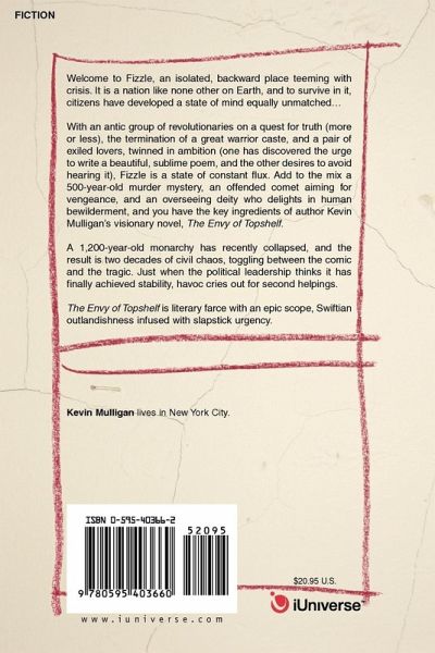 Welcome to Fizzle, an isolated, backward place teeming with crisis. It is a nation like none other on Earth, and to survive in it, citizens have developed a state of mind equally unmatched. With an antic group of revolutionaries on a quest for truth (more or less), the termination of a great warrior caste, and a pair of exiled lovers, twinned in ambition (one has discovered the urge to write a beautiful, sublime poem, and the other desires to avoid hearing it), Fizzle is a state of constant flux. Add to the mix a 500-year-old murder mystery, an offended comet aiming for vengeance, and an overseeing deity who delights in human bewilderment, and you have the key ingredients of author Kevin Mulligan's visionary novel, The Envy of Topshelf. A 1,200-year-old monarchy has recently collapsed, and the result is two decades of civil chaos, toggling between the comic and the tragic. Just when the political leadership thinks it has finally achieved stability, havoc cries out for second helpings. The Envy of Topshelf is literary farce with an epic scope, Swiftian outlandishness infused with slapstick urgency.