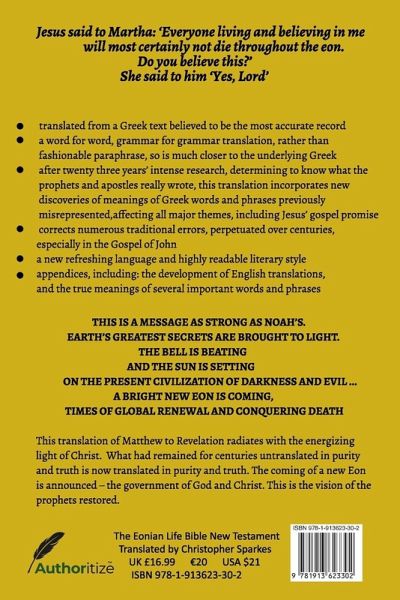 The first pure translation into English of the actual words of the Apostles - not influenced by creeds, traditions or the preconceptions of the translators. The actual words - not what was thought that they meant. The culmination of over two decades of intense scholarship and in-depth research by an academic frustrated with the repeated inaccuracies of centuries. "This translation unmasks historic twisting of the original Gospel message to support particular beliefs. It will be as controversial as John Wycliffe's first translation into English which was declared illegal for anyone to read by the church which had him declared a heretic." The Bible for a long time has been the world's number one selling book. Since the first English translation in 1380, more than 630 years ago, there have been around 150 English translations. So why do we need another one? Author, scholar, poet and grammar expert Christopher Sparkes from Petersfield, has spent twenty years painstakingly going back to the original Greek and Hebrew, and has identified "a thousand blunders" which have been repeatedly left uncorrected. Over the centuries, as translators strived to make the language more "modern" and understandable, so many errors and mistranslations have occurred that many of the original meanings have been obscured, or even lost. The acid test, according to Sparkes, is that if you translate the English versions back to their original Greek or Hebrew, they are too often nowhere near the original. So what has gone wrong? The problem facing translators is that they already knew - or thought they knew - the stories and teachings they were translating, so when the original Greek or Hebrew didn't quite fit with them, they "fidgeted" the words to make them fit with what they believed. Words have been added, taken away or changed to fit with specific creeds or beliefs. As George Gershwin wrote "The things that you're liable to read in the Bible - it ain't necessarily so!"