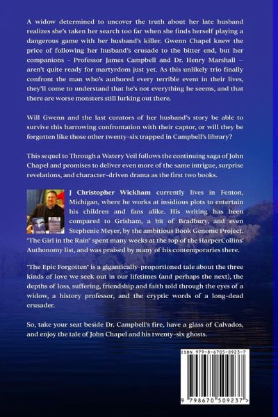 A widow determined to uncover the truth about her late husband realizes she's taken her search too far when she finds herself playing a dangerous game with her husband's killer. Gwenn Chapel knew the price of following her husband's crusade to the bitter end, but her companions - Professor James Campbell and Dr. Henry Marshall - aren't quite ready for martyrdom yet. As this unlikely trio finally confront the man who's authored every terrible event in their lives, they'll come to understand that he's not everything he seems, and that there are worse monsters still lurking out there. Will Gwenn and the last curator's of her husband's story be able to survive this harrowing confrontation with their captor, or will they be forgotten like those other twenty-six trapped in Campbell's library? This sequel to Through a Watery Veil follows the continuing saga of John Chapel and promises to deliver even more of the same intrigue, surprise revelations, and character-driven drama as the first two books. "The Epic Forgotten" is a gigantically-proportioned tale about the three kinds of love we seek out in our lifetimes (and perhaps the next), the depths of loss, suffering, friendship, and faith told through the eyes of a widow, a history professor, and the cryptic words of a long-dead crusader . So, take your seat beside Dr. Campbell's fire, have a glass of Calvados, and enjoy the tale of John Chapel and his twenty-six ghosts.
