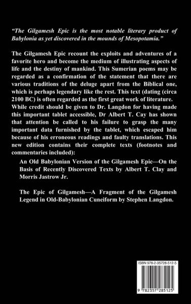 "The Gilgamesh Epic is the most notable literary product of Babylonia as yet discovered in the mounds of Mesopotamia."The Gilgamesh Epic recount the exploits and adventures of a favorite hero and become the medium of illustrating aspects of life and the destiny of mankind. This Sumerian poems may be regarded as a confirmation of the statement that there are various traditions of the deluge apart from the Biblical one, which is perhaps legendary like the rest. This text (dating (circa 2100 BC) is often regarded as the first great work of literature.While credit should be given to Dr. Langdon for having made this important tablet accessible, Dr Albert T. Cay has shown that attention be called to his failure to grasp the many important data furnished by the tablet, which escaped him because of his erroneous readings and faulty translations. This new edition contains their complete texts (footnotes and commentaries included): (1) An Old Babylonian Version of the Gilgamesh Epic-On the Basis of Recently Discovered Texts by Albert T. Clay and Morris Jastrow Jr. (2) The Epic of Gilgamesh-A Fragment of the Gilgamesh Legend in Old-Babylonian Cuneiform by Stephen Langdon. "Now with the tendency to attach to popular tales and nature myths lessons illustrative of current beliefs and aspirations, Gilgamesh's search for renewal of life is viewed as man's longing for eternal life. The sun-god's waning power after midsummer is past suggests man's growing weakness after the meridian of life has been left behind. Winter is death, and man longs to escape it. Gilgamesh's wanderings are used as illustration of this longing, and accordingly the search for life becomes also the quest for immortality. Can the precious boon of eternal life be achieved? Popular fancy created the figure of a favorite of the gods who had escaped a destructive deluge in which all mankind had perished. Gilgamesh hears of this favorite and determines to seek him out and learn from him the secret of eternal life. The deluge story, again a pure nature myth, symbolical of the rainy season which destroys all life in nature, is thus attached to the Epic. Gilgamesh after many adventures finds himself in the presence of the survivor of the Deluge who, although human, enjoys immortal life among the gods. He asks the survivor how he came to escape the common fate of mankind, and in reply Utnapishtim tells the story of the catastrophe that brought about universal destruction. The moral of the tale is obvious. Only those singled out by the special favor of the gods can hope to be removed to the distant "source of the streams" and live forever. The rest of mankind must face death as the end of life."