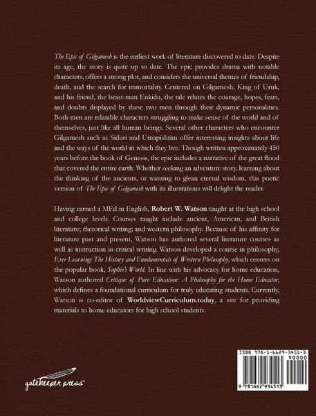 Robert W. Watson has taught at the high school and college levels. Courses taught include ancient, American, and British literature; rhetorical writing; and western philosophy. Because of his love for literature both past and present, Watson has authored several literature study guides as well as instruction in critical writing. Believing a basic course about philosophy was needed for high school students, Watson developed the course, Ever Learning: The History and Fundamentals of Western Philosophy which centers on the popular book, Sophie's World, and augmented with the Bible. Also, wanting to provide an edition suitable for young readers, Watson authored The Epic of Gilgamesh: A Poetic Version, illustrated by the popular artist, Mateoscopio. Currently, Watson is co-editor of WorldviewCurriculum.today, a site for providing materials to home educators for high school students.