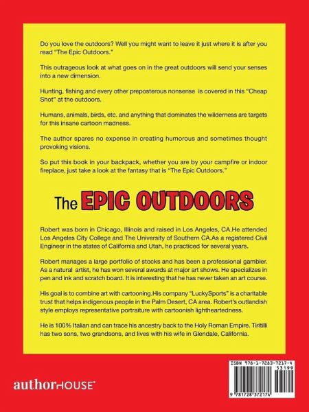 Do you love the outdoors? Well you might want to leave it just where it is after you read "The Epic Outdoors." This outrageous look at what goes on in the great outdoors will send your senses into a new dimension. Hunting, fishing and every other preposterous nonsense is covered in this "Cheap Shot" at the outdoors. Humans, animals, birds, etc. and anything that dominates the wilderness are targets for this insane cartoon madness. The author spares no expense in creating humorous and sometimes thought provoking visions. So put this book in your backpack, whether you are by your campfire or indoor fireplace, just take a look at the fantasy that is "The Epic Outdoors."