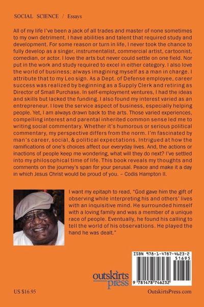 All of my life I've been a jack of all trades and master of none sometimes to my own detriment. I have abilities and talent that required study and development. For some reason or turn in life, I never took the chance to fully develop as a singer, instrumentalist, commercial artist, cartoonist, comedian, or actor. I love the arts but never could settle on one field. Nor put in the work and study required to excel in either category. I also love the world of business; always imagining myself as a man in charge. I attribute that to my Leo sign. As a Dept. of Defense employee, career success was realized by beginning as a Supply Clerk and retiring as Director of Small Purchase. In self-employment ventures, I had the ideas and skills but lacked the funding. I also found my interest varied as an entrepreneur. I love the service aspect of business, especially helping people. Yet, I am always drawn back to the arts. Those varied experiences, compelling interest and parental inherited common sense led me to writing social commentary. Whether it's humorous or serious political commentary, my perspective differs from the norm.