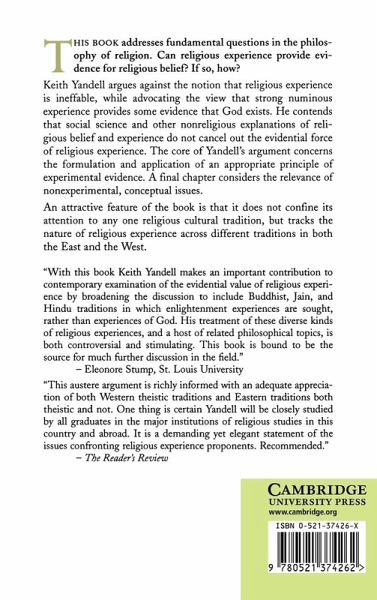 This book addresses fundamental questions in the philosophy of religion. Can religious experience provide evidence for religious belief? If so, how? Keith Yandell argues against the notion that religious experience is ineffable, while advocating the view that strong numinous experience provides some evidence that God exists. He contends that social science and other nonreligious explanations of religious belief and experience do not cancel out the evidential force of religious experience. The core of Yandell's argument concerns the formulation and application of an appropriate principle of experimental evidence. A final chapter considers the relevance of non-experimental, conceptual issues. An attractive feature of the book is that it does not confine its attention to any one religious cultural tradition, but tracks the nature of religious experience across different traditions in both the East and the West.