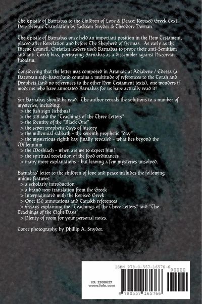 This volume includes the following unique features: > a scholarly introduction > a brand new translation > interpaginated with the Revised Greek > over 150 annotations and Tanakh references > essays explaining the "Teachings of the Three Letters" and "The Teachings of the Eight Days" > plenty of room for your personal notes. Barnabas should be read! He reveals the solutions to many great mysteries, including: > the revelation of the fish sign (ichthus) > the mysterious meaning of 318 > the "Teachings of the Three Letters" > the identity of the "Black One" > the seven prophetic days > the millennial sabbath day > the mysterious eighth day > when Moshiach? > the spirituality of the food ordinances > a few mysteries left unsolved.