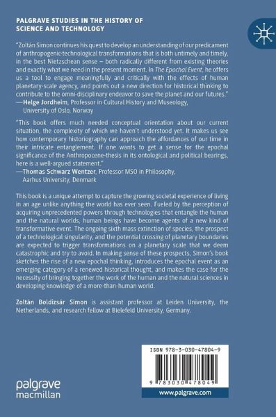 This book is a unique attempt to capture the growing societal experience of living in an age unlike anything the world has ever seen. Fueled by the perception of acquiring unprecedented powers through technologies that entangle the human and the natural worlds, human beings have become agents of a new kind of transformative event. The ongoing sixth mass extinction of species, the prospect of a technological singularity, and the potential crossing of planetary boundaries are expected to trigger transformations on a planetary scale that we deem catastrophic and try to avoid. In making sense of these prospects, Simon's book sketches the rise of a new epochal thinking, introduces the epochal event as an emerging category of a renewed historical thought, and makes the case for the necessity of bringing together the work of the human and the natural sciences in developing knowledge of a more-than-human world.