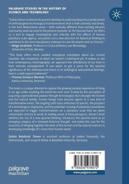 This book is a unique attempt to capture the growing societal experience of living in an age unlike anything the world has ever seen. Fueled by the perception of acquiring unprecedented powers through technologies that entangle the human and the natural worlds, human beings have become agents of a new kind of transformative event. The ongoing sixth mass extinction of species, the prospect of a technological singularity, and the potential crossing of planetary boundaries are expected to trigger transformations on a planetary scale that we deem catastrophic and try to avoid. In making sense of these prospects, Simon's book sketches the rise of a new epochal thinking, introduces the epochal event as an emerging category of a renewed historical thought, and makes the case for the necessity of bringing together the work of the human and the natural sciences in developing knowledge of a more-than-human world.