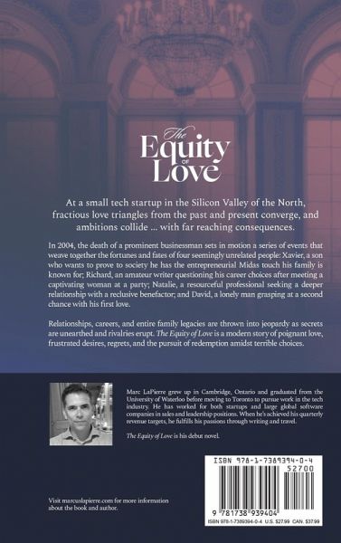 At a small tech startup in the Silicon Valley of the North, fractious love triangles from the past and present converge and ambitions collide with far reaching consequences. In 2004, the death of a prominent businessman sets in motion a series of events that weave together the fortunes and fates of four seemingly unrelated people: Xavier, a son who wants to prove to society he has the entrepreneurial Midas touch his family is known for; Richard, an amateur writer questioning his career choices after meeting a captivating woman at a party; Natalie, a resourceful professional seeking a deeper relationship with a reclusive benefactor; and David, a lonely man grasping at a second chance with his first love. Relationships, careers, and entire family legacies are thrown into jeopardy as secrets are unearthed and rivalries erupt. The Equity of Love is a modern story of poignant love, frustrated desires, regrets, and the pursuit of redemption amidst terrible choices.