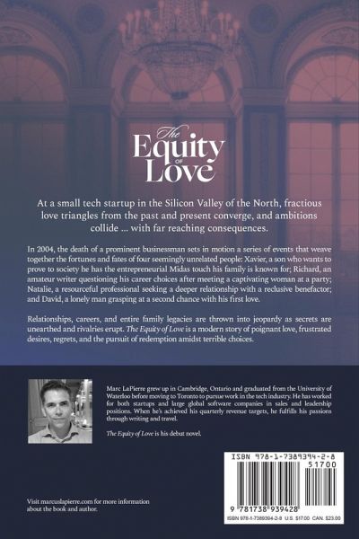 At a small tech startup in the Silicon Valley of the North, fractious love triangles from the past and present converge and ambitions collide with far reaching consequences. In 2004, the death of a prominent businessman sets in motion a series of events that weave together the fortunes and fates of four seemingly unrelated people: Xavier, a son who wants to prove to society he has the entrepreneurial Midas touch his family is known for; Richard, an amateur writer questioning his career choices after meeting a captivating woman at a party; Natalie, a resourceful professional seeking a deeper relationship with a reclusive benefactor; and David, a lonely man grasping at a second chance with his first love. Relationships, careers, and entire family legacies are thrown into jeopardy as secrets are unearthed and rivalries erupt. The Equity of Love is a modern story of poignant love, frustrated desires, regrets, and the pursuit of redemption amidst terrible choices.