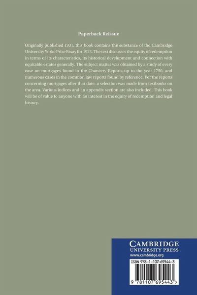 Originally published 1931, this book contains the substance of the Cambridge University Yorke Prize Essay for 1923. The text discusses the equity of redemption in terms of its characteristics, its historical development and connection with equitable estates generally. The subject matter was obtained by a study of every case on mortgages found in the Chancery Reports up to the year 1750, and numerous cases in the common law reports found by reference. For the reports concerning mortgages after that date, a selection was made from textbooks on the area. Various indices and an appendix section are also included. This book will be of value to anyone with an interest in the equity of redemption and legal history.