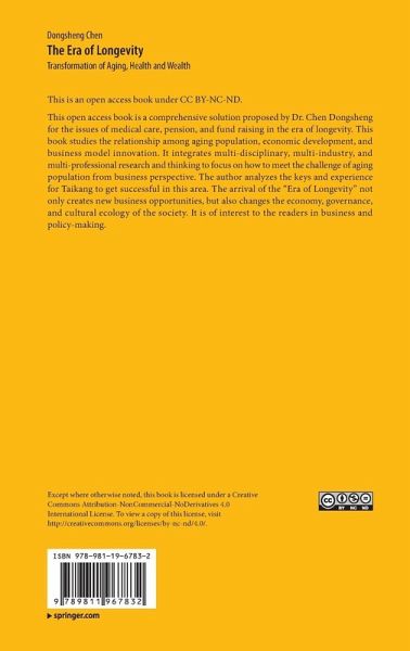 This is an open access book under CC BY-NC-ND.This open access book is a comprehensive solution proposed by Dr. Chen Dongsheng for the issues of medical care, pension, and fund raising in the era of longevity. This book studies the relationship among aging population, economic development, and business model innovation. It integrates multi-disciplinary, multi-industry, and multi-professional research and thinking to focus on how to meet the challenge of aging population from business perspective. The author analyzes the keys and experience for Taikang to get successful in this area. The arrival of the "Era of Longevity" not only creates new business opportunities, but also changes the economy, governance, and cultural ecology of the society. It is of interest to the readers in business and policy-making.