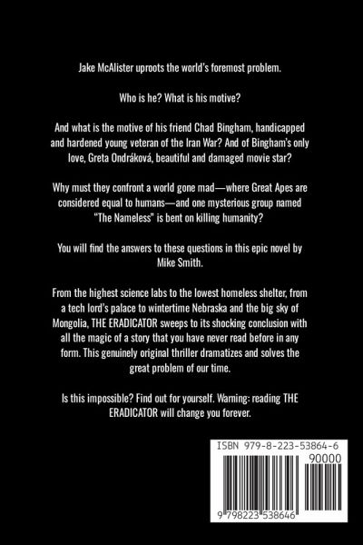 Jake McAlister uproots the world's foremost problem. Who is he? What is his motive? And what is the motive of his friend Chad Bingham, handicapped and hardened young veteran of the Iran War? And of Bingham's only love, Greta Ondráková, beautiful and damaged movie star? Why must they confront a world gone mad-where Great Apes are considered equal to humans-and one mysterious group named "The Nameless" is bent on killing humanity? You will find the answers to these questions in this epic novel by Mike Smith. From the highest science labs to the lowest homeless shelter, from a tech lord's palace to wintertime Nebraska and the big sky of Mongolia, THE ERADICATOR sweeps to its shocking conclusion with all the magic of a story that you have never read before in any form. This genuinely original thriller dramatizes and solves the great problem of our time. Is that impossible? Find out for yourself. Warning: reading THE ERADICATOR will change you forever.