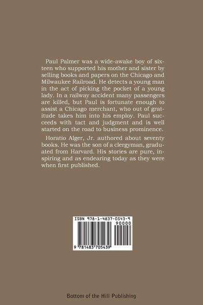 Paul Palmer was a wide-awake boy of sixteen who supported his mother and sister by selling books and papers on the Chicago and Milwaukee Railroad. He detects a young man in the act of picking the pocket of a young lady. In a railway accident many passengers are killed, but Paul is fortunate enough to assist a Chicago merchant, who out of gratitude takes him into his employ. Paul succeeds with tact and judgment and is well started on the road to business prominence. Horatio Alger, Jr. authored about seventy books. He was the son of a clergyman, graduated from Harvard. His stories are pure, inspiring and as endearing today as they were when first published.