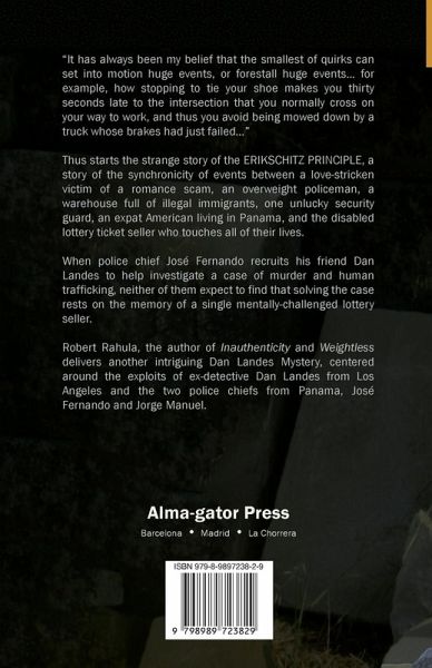 "It has always been my belief that the smallest of quirks can set into motion huge events, or forestall huge events... for example, how stopping to tie your shoe makes you thirty seconds late to the intersection that you normally cross on your way to work, and thus you avoid being mowed down by a truck whose brakes had just failed..." Thus starts the strange story of the ERIKSCHITZ PRINCIPLE, a story of the synchronicity of events between a love-stricken victim of a romance scam, an overweight policeman, a warehouse full of illegal immigrants, one unlucky security guard, an expat American living in Panama, and the disabled lottery ticket seller who touches all of their lives. When police chief José Fernando recruits his friend Dan Landes to help investigate a case of murder and human trafficking, neither of them expect to find that solving the case rests on the memory of a single mentally-challenged lottery seller. Robert Rahula, the author of Inauthenticity and Weightless delivers another intriguing Dan Landes Mystery, centered around the exploits of ex-detective Dan Landes from Los Angeles and the two police chiefs from Panama, José Fernando and Jorge Manuel.