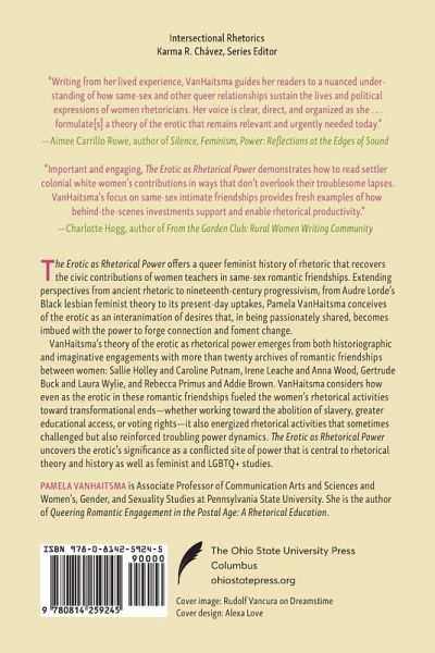 Winner, 2025 Marie Hochmuth Nichols Award from the National Communication Association's Public Address Division The Erotic as Rhetorical Power offers a queer feminist history of rhetoric that recovers the civic contributions of women teachers in same-sex romantic friendships. Extending perspectives from ancient rhetoric to nineteenth-century progressivism, from Audre Lorde's Black lesbian feminist theory to its present-day uptakes, Pamela VanHaitsma conceives of the erotic as an interanimation of desires that, in being passionately shared, becomes imbued with the power to forge connection and foment change. VanHaitsma's theory of the erotic as rhetorical power emerges from both historiographic and imaginative engagements with more than twenty archives of romantic friendships between women: Sallie Holley and Caroline Putnam, Irene Leache and Anna Wood, Gertrude Buck and Laura Wylie, and Rebecca Primus and Addie Brown. VanHaitsma considers how even as the erotic in these romantic friendships fueled the women's rhetorical activities toward transformational ends-whether working toward the abolition of slavery, greater educational access, or voting rights-it also energized rhetorical activities that sometimes challenged but also reinforced troubling power dynamics. The Erotic as Rhetorical Power uncovers the erotic's significance as a conflicted site of power that is central to rhetorical theory and history as well as feminist and LGBTQ+ studies.