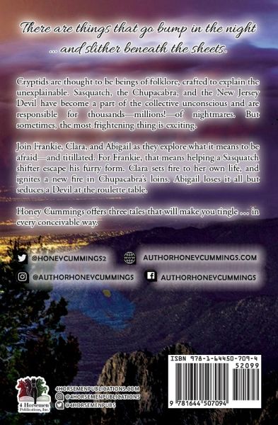 There are things that go bump in the night ... and slither beneath the sheets. Cryptids are thought to be beings of folklore, crafted to explain the unexplainable. Sasquatch, the Chupacabra, and the New Jersey Devil have become a part of the collective unconscious and are responsible for thousands-millions!-of nightmares. But sometimes, the most frightening thing is exciting. Join Frankie, Clara, and Abigail as they explore what it means to be afraid-and titillated. For Frankie, that means helping a Sasquatch shifter escape his furry form. Clara sets fire to her own life, and ignites a new fire in Chupacabra's loins. Abigail loses it all but seduces a Devil at the roulette table. Honey Cummings offers three tales that will make you tingle ... in every conceivable way.