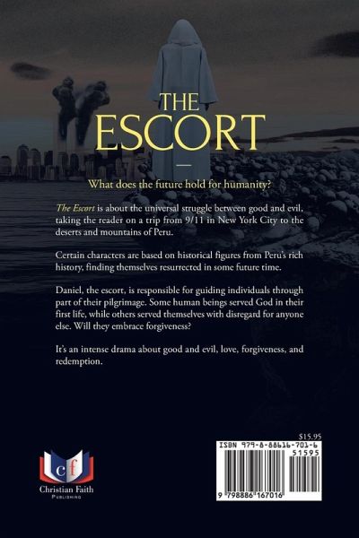 What does the future hold for humanity? The Escort is about the universal struggle between good and evil, taking the reader on a trip from 9/11 in New York City to the deserts and mountains of Peru. Certain characters are based on historical figures from Peru's rich history, finding themselves resurrected in some future time. Daniel, the escort, is responsible for guiding individuals through part of their pilgrimage. Some human beings served God in their first life, while others served themselves with disregard for anyone else. Will they embrace forgiveness? It's an intense drama about good and evil, love, forgiveness, and redemption.