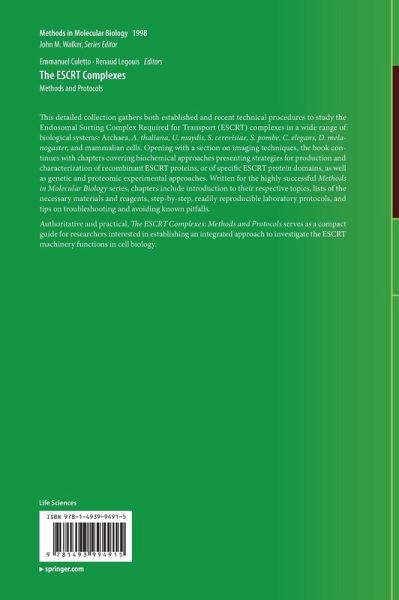 Analysis of the Archaeal ESCRT Apparatus.- Genetic and Cell Biology Methods to Study ESCRTs in Drosophila melanogaster.- Functional Analysis of ESCRT-Positive Extracellular Vesicles in the Drosophila Wing Imaginal Disc.- Subcellular Localization of ESCRT-II in the Nematode C. elegans by Correlative-Light Electron Microscopy.- Proximity Ligation Assay (PLA) to Determine the Endosomal Localization of ESCRT Subunit in Virus-Infected Cells.- Immuno-Localization of ESCRT Proteins in Virus-Infected Cells by Fluorescence and Electron Microscopy.- Single Cell Fluorescence Ratio Image Analysis for Studying ESCRT Function in Receptor Trafficking.- Genetic and Biochemical Analyses of Yeast ESCRT.- Live Imaging of ESCRT Proteins in Microfluidically-Isolated Hippocampal Axons.- Studying the Spatial Organization of ESCRTs in Cytokinetic Abscission Using the High Resolution Imaging Techniques SIM and Cryo-SXT.- Three Dimensional Surface Rendering of ESCRT Proteins Microscopy Data UsingUCSF Chimera Software.- Transient Expression of ESCRT-Components in Arabidopsis Root Cell Suspension Culture-Derived Protoplasts.- Crystallization and Biophysical Approaches for Studying the Interactions between the Vps4-MIT Domain and ESCRT-III Proteins.- Biochemical Approaches to Studying C. elegans ESCRT Function In Vitro.- Purification of Recombinant ESCRT-III Proteins and Their Use in Atomic Force Microscopy and In Vitro Binding and Phosphorylation Assays.- Assessment of ESCRT Protein CHMP5 Activity on Client Protein Ubiquitination by Immunoprecipitation and Western Blotting.- Purification of Plant ESCRT Proteins for Polyclonal Antibody Production.- Genetic and Cytological Methods to Study ESCRT Cell Cycle Function in Fission Yeast.- ESCRT Mutant Analysis and Imaging of ESCRT Components in the Model Fungus Ustilago maydis.- Genetic Suppressor Screen Using an Inducible FREE1-RNAi Line to Detect ESCRT Genetic Interactors in Arabidopsisthaliana.- Screening of Interactions with the ESCRT Machinery by a Gaussia princeps Split Luciferase-Based Complementation Assay.- RNA Interference-Mediated Inhibition of ESCRT in Mammalian Cells.