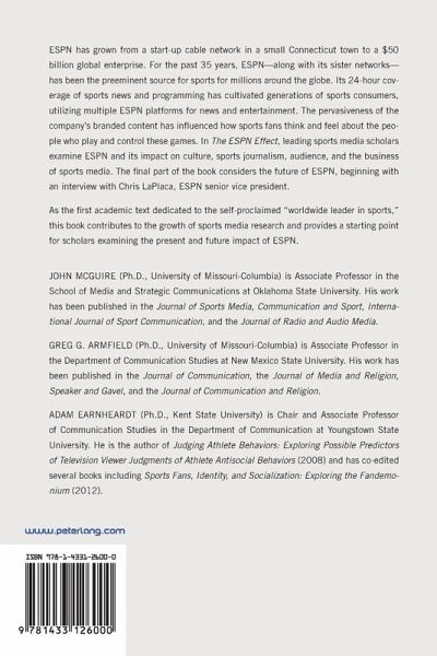 ESPN has grown from a start-up cable network in a small Connecticut town to a $50 billion global enterprise. For the past 35 years, ESPN - along with its sister networks - has been the preeminent source for sports for millions around the globe. Its 24-hour coverage of sports news and programming has cultivated generations of sports consumers, utilizing multiple ESPN platforms for news and entertainment. The pervasiveness of the company's branded content has influenced how sports fans think and feel about the people who play and control these games. In The ESPN Effect, leading sports media scholars examine ESPN and its impact on culture, sports journalism, audience, and the business of sports media. The final part of the book considers the future of ESPN, beginning with an interview with Chris LaPlaca, ESPN senior vice president. As the first academic text dedicated to the self-proclaimed «worldwide leader in sports», this book contributes to the growth of sports media research and provides a starting point for scholars examining the present and future impact of ESPN.