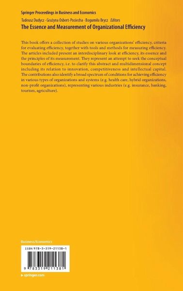 This book offers a collection of studies on various organizations' efficiency, criteria for evaluating efficiency, together with tools and methods for measuring efficiency. The articles included present an interdisciplinary look at efficiency, its essence and the principles of its measurement. They represent an attempt to seek the conceptual boundaries of efficiency, i.e. to clarify this abstract and multidimensional concept including its relation to innovation, competitiveness and intellectual capital. The contributions also identify a broad spectrum of conditions for achieving efficiency in various types of organizations and systems (e.g. health care, hybrid organizations, non-profit organizations), representing various industries (e.g. insurance, banking, tourism, agriculture).
