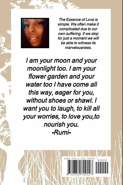 The Essence of Love is simple poetry. It offers the readers, a time to reflect on small moments of life. Taking the time to slow down, breath, and develop positive thoughts about love. All creation is love.